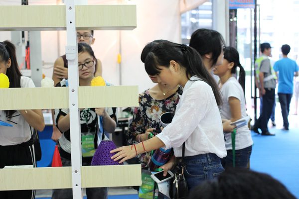 学生在印刷展上观看3D打印产品