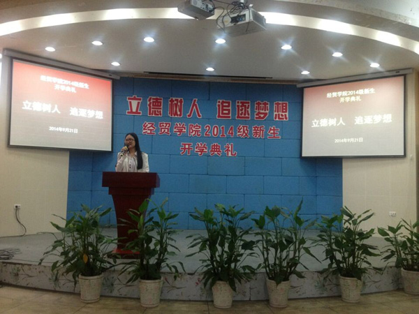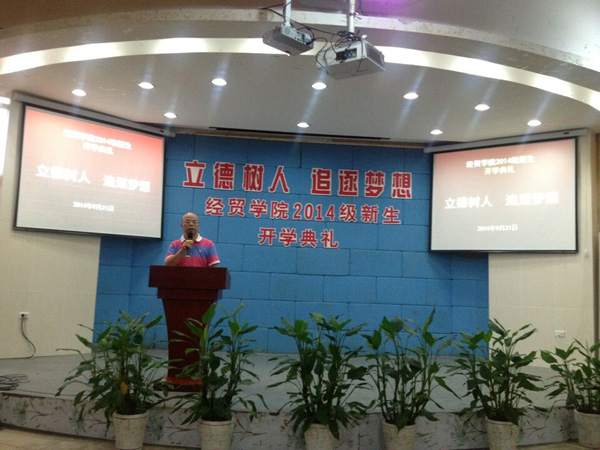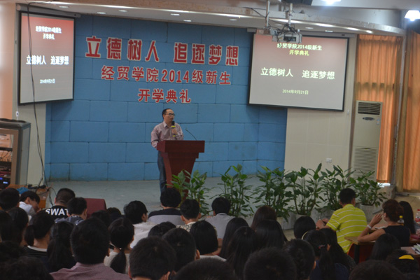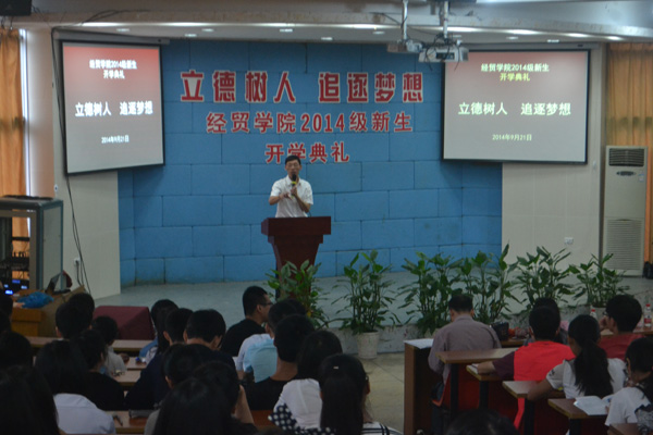 9月21日上午,经贸学院在阶梯教室举行了以“立德树人,追逐梦想”为主题的新生集中始业教育大会。会议分两场举行,由经贸学院院长助理丁长峰老师主持,经贸学院院长汪焰、党总支书记项光春、电子商务教研室主任成荣芬担任本次主要讲话嘉宾,经贸学院全体行政人员、全体新生班主任以及2014级540多名新生参加了此次大会。大会在视频《经贸学院的骄傲》中拉开帷幕,让新生充分感受到成为经贸学院一员的光荣。