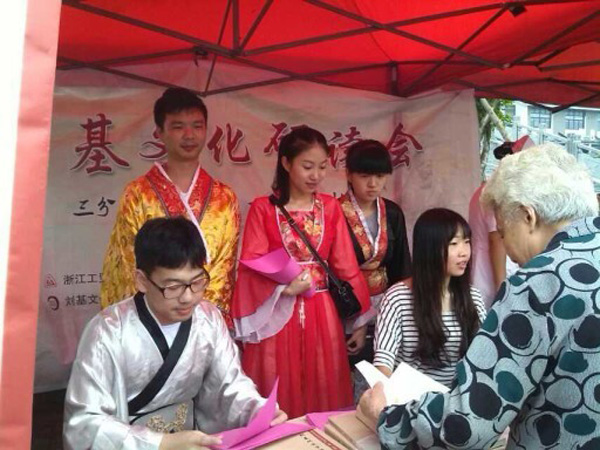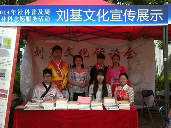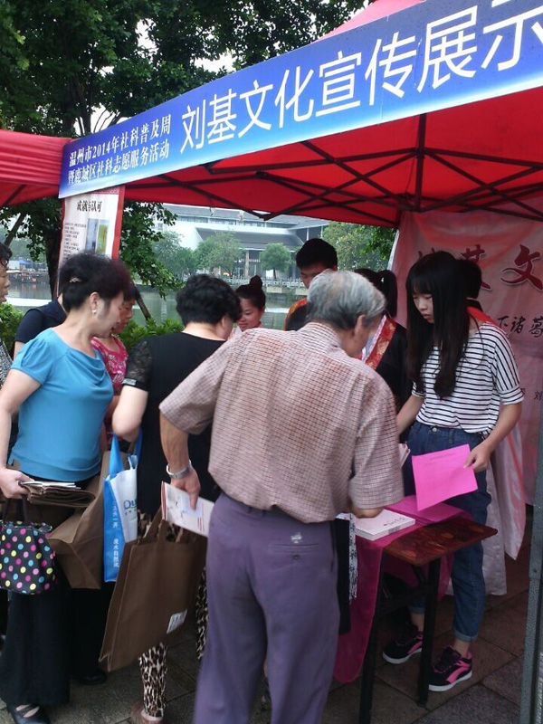 9月25日,温州市刘基文化研究会、浙工贸刘基文化省科普示范基地在白鹭洲公园参加由中共温州市委宣传部、温州市社科联主办的市科普周开幕式,进行刘基文化展示活动,通过书籍、易拉宝、穿着古装分发卡片等多种形式进行宣传。