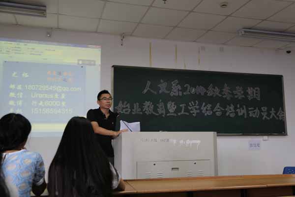 9月14日下午2点,人文系在6304人文道德讲堂召开了2014秋季学期始业教育及工学结合培训动员大会,人文系党总支副书记徐辉老师、辅导员老师、全体班主任老师以及人文系全体学生参加大会。