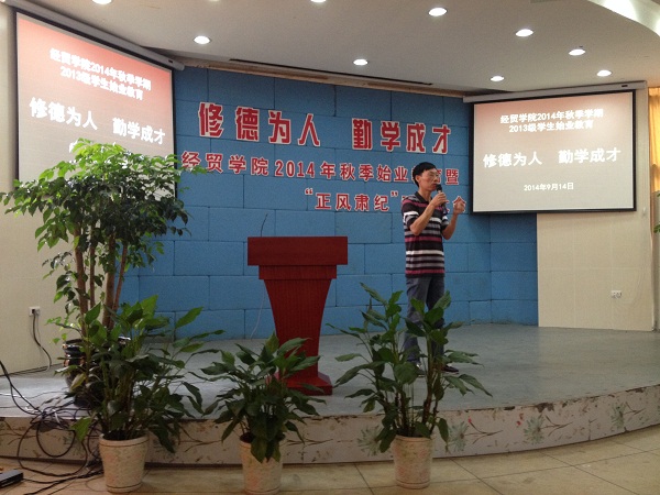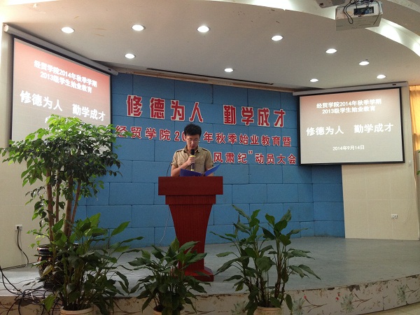 9月14日,经贸学院2014年秋季学期始业教育暨“正风肃纪”动员大会在1号楼阶梯教室顺利举行。经贸学院党总支书记项光春、经贸学院院长助理丁长峰,以及全体辅导员和全体班主任参加,近1000名学生接受教育。