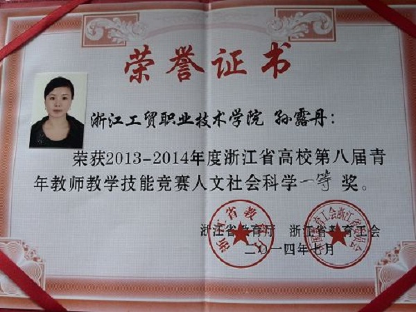 6月30日至7月1日,浙江省高校第八届青年教师教学技能竞赛在浙江大学紫荆港校区举行。经过激烈角逐,我院人文系孙露丹老师荣获人文社科组一等奖。