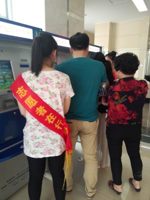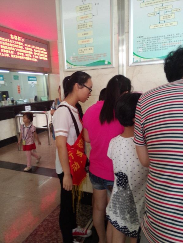 7月6日是这支实践队暑期社会实践的第五天,跟往常一样,上午7:50,他们在中西医院门口集合,8:00准时开始了他们的服务工作。他们分成了两小队,一队在门诊大楼,一队在儿童楼。星期一,来医院看病的人一如既往的多。在门诊大楼那边,大多是成人、老人过来看病。志愿者的工作主要是为告诉求医的人如何使用多功能自助终端器,引导指路等。在儿童楼,志愿者在完成上述工作的同时,有时候还要帮助一些家长临时照顾小孩,哄带小孩,帮小孩们止住那因为疼痛而带来的眼泪。