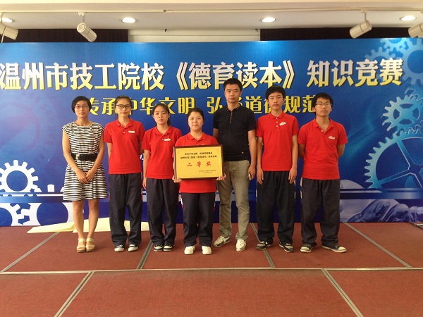 6月12日,温州市技工院校学生《德育读本》知识竞赛在温州技师学院南校区举行,本次比赛共有6支代表队,30名学生参赛,我院代表队张杰克、季阿勇等5名学生参加了本次比赛。本次比赛分为笔试和现场答题两部分,我院学生在笔试明显落后的情况下,不放弃,不气馁,迎难而上,充分发挥团队力量,将比分逐步拉近并反超,最后在比赛中取得团队第二名的好成绩。