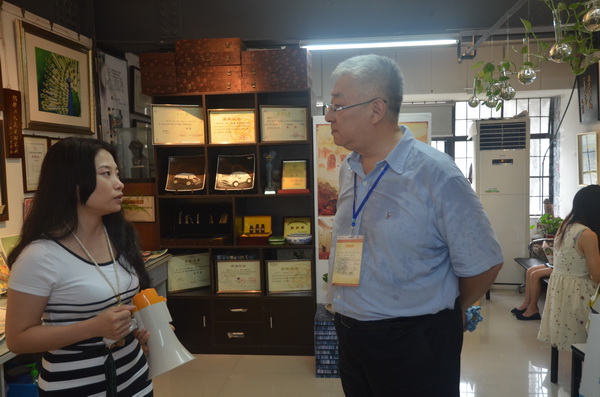 参观我院浙江创意园,是此次采风活动的一个重要环节。天空时而落下雨珠,给活动带来些许不便,但采风嘉宾们的参观热情丝毫没有消减。他们在移步换景中纷纷按下相机快门。采风嘉宾们在我院院长贺星岳教授的陪同下,先后考察了卡伊文化交流中心、学院创意设计类工作室、7号LOFT艺术中心和省级特色工业设计基地等,并逐一了解了园区定位、发展以及入驻企业情况。贺星岳院长向嘉宾们介绍了学院基于创新创业的理念,依托学校、园区、城市联动发展,构建形成“学园城一体化”的办学模式。在非物质文化遗产传承教学基地的工作室中,嘉宾们被一件件精美绝伦的瓯绣、瓯塑作品深深吸引,更对它们的独特文化底蕴赞叹不已。