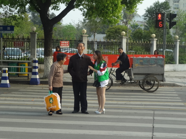 活动时,马路两端各站着两名志愿者,一位站在斑马线中央等候休息区进行劝导。当绿灯结束前,志愿者们手拉起交通文明的横幅,劝阻和提醒想闯红灯的行人。期间,两位老人没有注意到红灯颤颤巍巍地过马路,被志愿者们礼貌地劝阻下来并在绿灯亮起时扶着他们过马路。当绿灯结束前,志愿者迅速手拉横幅向一侧靠拢,以便让行人通行。