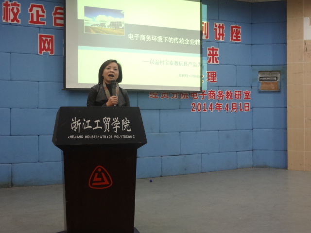 经贸学院党总支书记项光春作开篇讲话,他以多种数据来解说,在未来20年中国的经济发展趋势中,电子商务有着良好的发展前景。接着,温州宝泰实业有限公司总经理周杨晓上台演讲。周经理也强调了电子商务的良好发展前景,同时还介绍了产品——教玩具的规格、用途、优点等。激发了同学们的创业欲望,赢得同学们的阵阵掌声。之后是提问环节,同学们踊跃发言,周经理详细的为学生们解答各种疑问,学生们还赢得了教玩具的纪念品。现场气氛热闹,活跃。