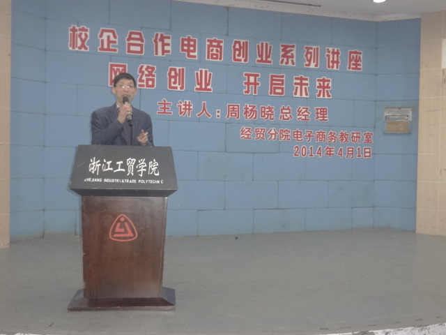 4月1日晚上6点,经贸学院在阶梯教室举行以“网络创业,开启未来”为主题的校企合作、电商创业系列的讲座。邀请温州宝泰实业有限公司总经理周杨晓主讲,我院13级和12级电商专业的全体学生参加。