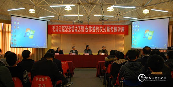 12月19日下午,我院与海峡对岸的台湾东服企业有限公司签订校企合作意向书并举行专题讲座。学院副院长张俊平、台湾东服企业有限公司董事长冯五峰、汽机学院院长周章添、校企合作办主任贾永枢、汽机学院副院长钟振忠(挂职),汽机学院与材料工程系全体教师及学生参与本次活动。