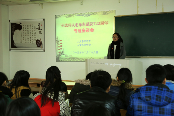 近日,人文系举行了“纪念伟人毛泽东诞辰120周年专题座谈会”。人文系党总支副书记徐辉老师、辅导员叶盛芳老师等及人文系全体在校学生参加了座谈活动。本次活动由人文系党总支及学生会联合举办。