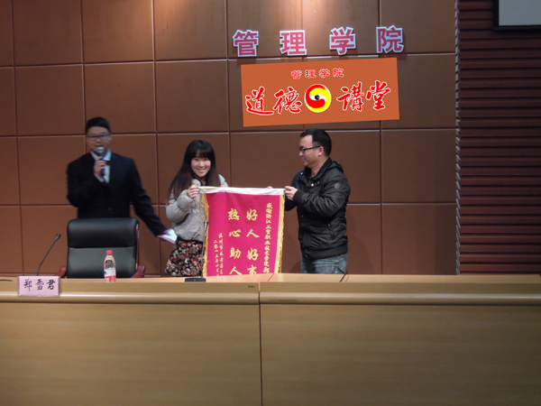 其实在我们身边也有许多道德标兵、学习榜样,管理学院就有一位同学因帮助一对因车祸而受伤的姐弟,受到家长与社会的赞扬。昨晚,我们也把这位做好事的同学郑珏(酒管1202班)请到现场,让她讲述如何帮助受伤的小朋友,最后张勰老师代受伤的小学生家长给郑珏同学转交了“热心助人好人好事”的锦旗。