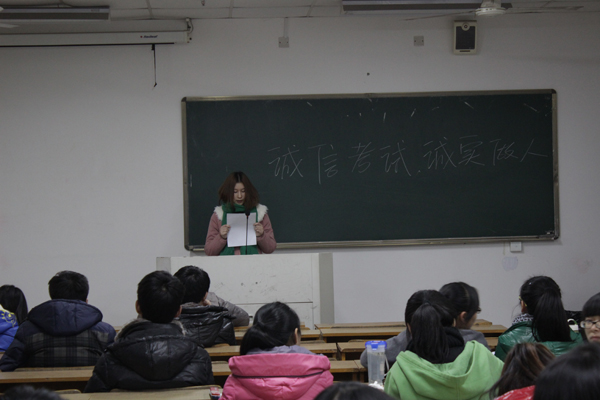 因此面对即将到来的期末考试,轻工系团总支学生会纪检部与各班班委在各班进行诚信考试倡议活动。活动开始先是各班班长宣读活动倡议书,并将学生手册中针对考试作弊相关处分进行说明,随后传阅“诚信考试,诚实做人”倡议书,并让同学们郑重签上自己的姓名,许下一份承诺,做出一个保证。