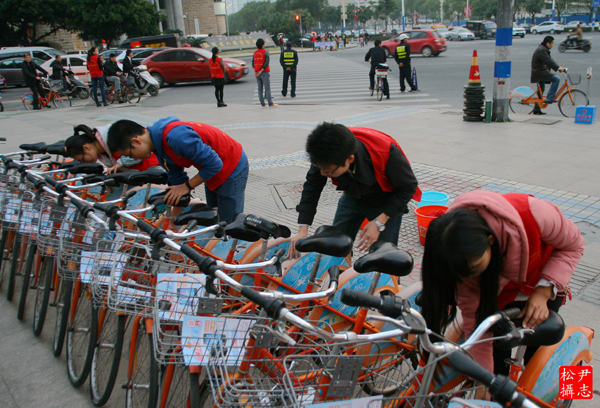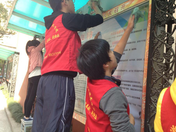 在校内,红马甲志愿者深入各栋寝室,擦拭寝室楼大门、窗台以及诚信阁。同时也对校园内的宣传布告栏进行大清理。看着灰尘被擦拭干净,是对志愿者活动的极大鼓励;在校外,志愿者们在交通拥挤的十字路口协助警察劝导行人遵守交通规则,活动期间正值下班高峰期,十字路口的人流量、车流量大,交通事故易发,劝导行人遵守交通规则意义重大。志愿者们擦拭公共自行车,帮助自行车管理员及时补充自行车数量,方便市民出行。