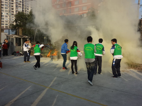 保卫处赵老师向在场学生宣传消防知识。赵老师强调,秋冬两季风干物燥,用电用气现象增多,火灾频发,能吞噬人们的美好生活。应提高警惕,远离火灾。随后,赵老师当场演示了消防器材的使用方法,同学们也纷纷积极上前求教学习。最后,学生进行3人30米趣味比赛,现场气氛非常活跃,3+2电子商务1301班获得了第一名的好成绩。