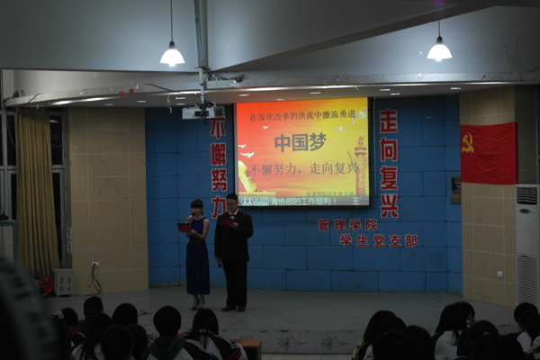 为深入学习贯彻党的十八大精神,引导学生认真学习和理解“中国梦”的理论核心,畅想中华民族伟大复兴的光明前景,教育和引导同学们树立正确的世界观、人生观与价值观,努力为实现国家富强、民族复兴、人民幸福的伟大梦想而刻苦学习、发奋成才。11月19日晚上,管理学院学生党支部在阶梯教室开展了以“不懈努力走向复兴”为主题的大型活动,大一新生参与本次活动。管理学院党总支副书记张勰和辅导员陈君出席了这次活动。