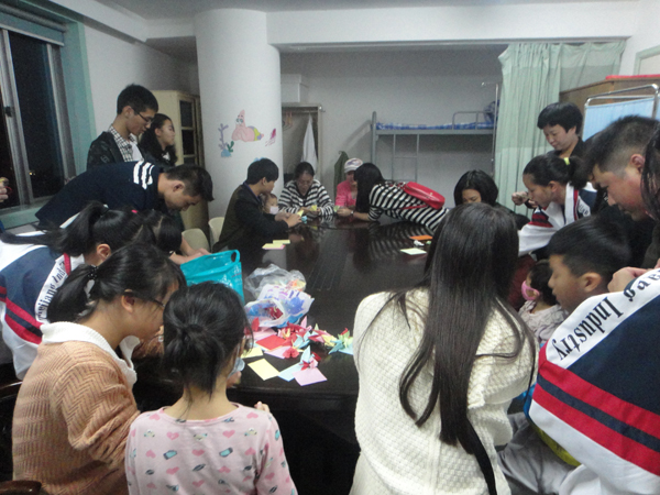 学院志愿者在“温州生命源泉志愿队”的队长田志军先生的带领下,见到了白血病儿童和他们的家长。在与孩子们的游戏互动中,大家拿出了准备好的千纸鹤,孩子们见了都很高兴,很喜欢。做过必要的消毒洗手后同学们开始手把手教孩子们折千纸鹤和爱心,并让孩子们在爱心上写下自己的心愿。同时,志愿者带去的惊奇魔术表演赢得了孩子们的啧啧赞叹,他们纷纷嚷着要学。医生告诉我们由于孩子的身体原因,互动过程不能太久,但是我们志愿者在短短40多分钟里用自己的实际行动给孩子们带去了快乐,带去了生命的正能量。事后医院的工作人员跟志愿者分享很多关于白血病,关于这些孩子的知识和信息。护士们说这些孩子都是小勇士,打针抽血什么的都会咬牙坚持,他们有些甚至还不知道自己得的是什么病。领队田志军先生说成分血对于这些孩子十分重要,他已经献成分血达到60余次,在温州还有很多和他一样的很多志愿者,他们献出的血将全部用于治疗这些白血病人。