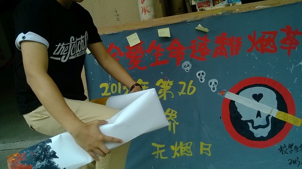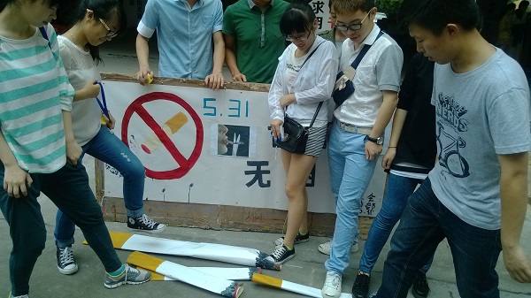 活动开始后,各院系同学积极参与到吸烟危害健康的现场试验中,触目的画面给在场的学生强烈的心灵震撼,也告诉我们小小的烟头会给人体带来巨大危害。同时活动广场上还放置了两根巨型香烟,邀请同学写下对吸烟者劝诫的话,并摆出各种戒烟造型,以此劝诫同学们远离烟草。在校外,在杨府山公园,学院红马甲志愿者也在行动,他们利用课余时间在公园内捡取丢弃的烟头并劝导吸烟者珍惜生命,戒除吸烟。