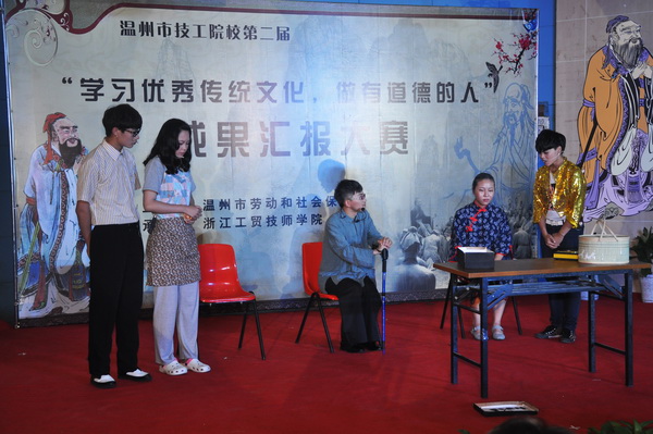传承中华经典、弘扬传统文化。5月31日下午,温州市第二届技工院校“学习优秀传统文化,做有道德的人”成果汇报大赛在我院举行。此次比赛由温州市劳动和社会保障局主办,我院技师学院承办,温州技师学院、平阳技工学校、瑞安技工学校等8所公办技工院校参加了比赛。