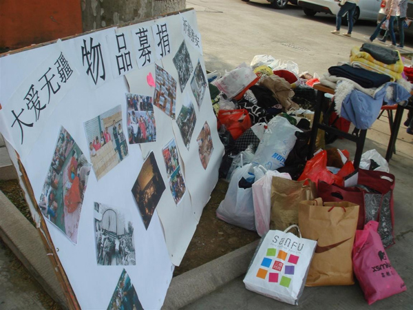 4月27日中午,“大爱无疆,祈福雅安”爱心募捐活动正式拉开了序幕。志愿者们拿着准备好的宣传品,一一向过往的同学阐述活动意义。许多同学在了解了活动之后,都毫不犹豫地回寝室整理了自己的衣物拿到募捐现场,并在便利贴上写下了自己满满的祝福。更是有位开淘宝店的学生捐出了60双新鞋子,当我们问其名字时,他只是微笑着说:“我只是尽了绵薄之力。”