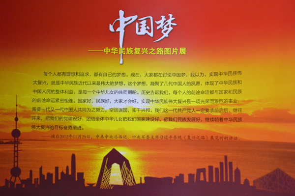 “每个人都有理想和追求,都有自己的梦想。现在,大家都在讨论中国梦,我以为,实现中华民族伟大复兴,就是中华民族近代以来最伟大的梦想。这个梦想,凝聚了几代中国人的夙愿,体现了中华民族和中国人民的整体利益,是每一个中华儿女的共同期盼。历史告诉我们,每个人的前途命运都与国家和民族的前途命运紧密相连。国家好,民族好,大家才会好。实现中华民族伟大复兴是一项光荣而艰巨的事业,需要一代又一代中国人共同为之努力。空谈误国,实干兴邦。我们这一代共产党人一定要承前启后、继往开来,把我们的党建设好,团结全体中华儿女把我们国家建设好,把我们民族发展好,继续朝着中华民族伟大复兴的目标奋勇前进。” 这是中共中央总书记、中华人民共和国主席、中央军委主席习近平参观《复兴之路》展览时的讲话。让我们怀揣中国梦,团结一心,努力奋斗,继续开拓中华民族的复兴之路。