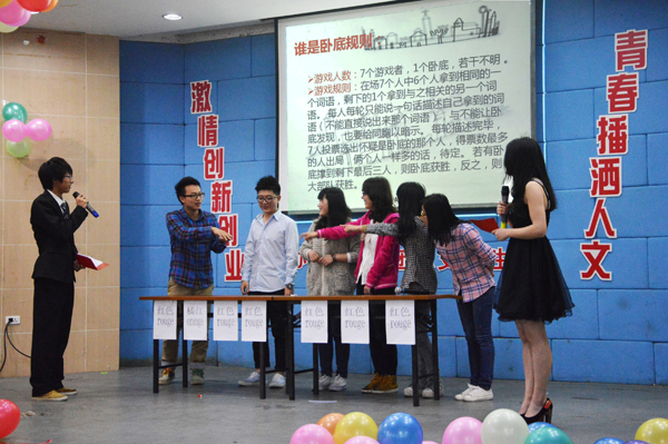 在主题活动中,无论是动感十足,展现了当代大学生的青春与活力的热舞,赢得笑声不断学生自己创新改编、幽默解读创新创业意识的小品《新武林外传》、《新白雪公主》,还是带领大家回味童真趣事的法语动画配音《美女与巫师》,以及同学们自编自演、展现法国风情的模特走秀《show time》等,都点燃了场内观众的热情、赢得掌声不断。在随后的互动环节,主持人通过《谁是卧底》的游戏教同学学习法语的单词:“cheveux” (头发),“table”(桌子)等,并为正确发音者发送精美小礼品,将现场气氛推向高潮。最后,法语1201班的全体同学合唱中法版《我的歌声里》圆满结束了此次活动。