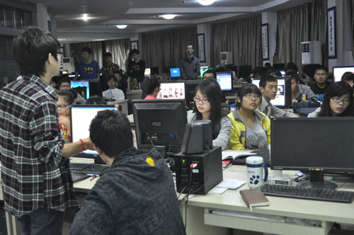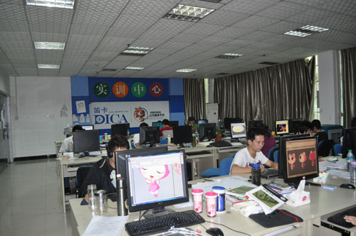 金秋十月,入夜已久,南昌东郊,一座写字楼内却灯火通明,一大群年青却在忙碌着。一张张稍带稚嫩脸,略带倦色,但却精神抖擞,干劲十足。CPU风扇的轰鸣声,鼠标点击声,以及低沉的讨论声,构成了一幅都市白领忙碌职场场景。这不是电视剧或电影的一个场景,也不是都市高档写字楼白领们工作场景,而是我院信息传媒学院11级动漫专业学生在