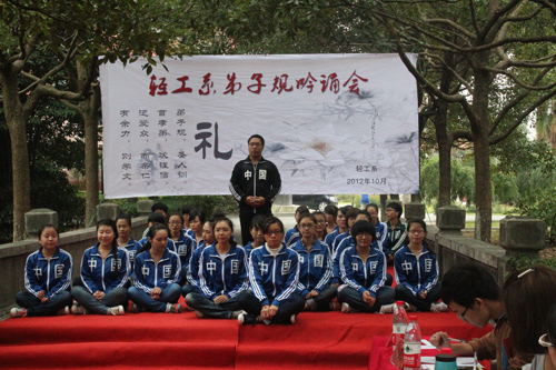 为迎接十八大的胜利召开,传承弘扬中国传统文化,深化轻工系“礼文思政”的学生工作理念,10月27日早上八点半轻工系全体大一新生在僻静清幽的校园一角展开了“梦想从这里起航”之《弟子规》吟诵会与跳绳比赛,在轻工系党总支书记任志杰老师的开幕辞中,本次活动正式拉开帷幕。