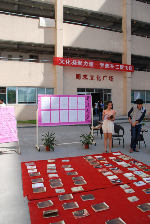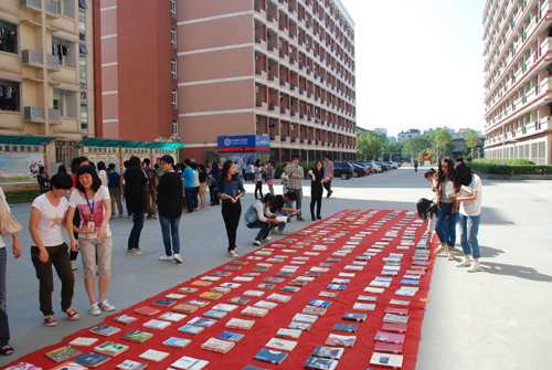为了庆祝中国作家莫言荣获2012年诺贝尔文学奖,10月15日中午图书馆和宿管会在学子广场开展莫言等我国著名文学作家作品展示及现场借书活动。此次活动展出了我国著名文学作家莫言先生代表作《红高梁家族》、《丰乳肥臀》、《生死疲劳》、《酒国》、《檀香刑》、《走向诺贝尔》、《白棉花》等40多种图书,并精选了部分其他著名作家作品共400来册图书。为了广大师生可以更加方便的借阅图书,并在现场设立了借书处,帮助读者现场借书。现场共借出图书130册。