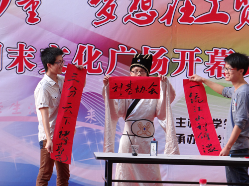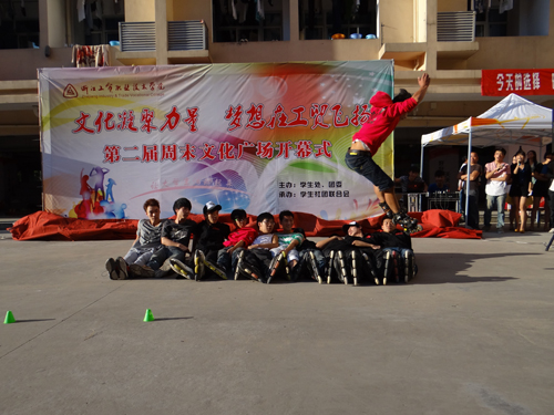 此次开幕式由“文化凝聚力量 梦想在工贸飞扬”为主题展开,在周末文化广场上,学院的学生社团纷纷拿出自己的绝活,刘基研读会的《刘基文化》视频宣传片将学生带入到刘伯温生活过的时代,向学生展示了刘伯温立功、立德、立言的三不朽伟人风采。品逸社也向学生展示了古色古香的中国文化传承。随后的各个社团节目精彩纷呈,精武门的动感舞蹈和街舞社的精彩街舞分别作为开头和结尾部分的节目,无不透着青春特有的活力和风采。魔术社和跆拳道俱乐部的精彩表演以及过人的胆识同时赢得了现场老师和同学们的热烈鼓掌。Anyway轮滑社的动感表演也博得台下一浪高过一浪的掌声和喝彩。歌友俱乐部的《我的歌声里》以优美的旋律和动人的风格将大学生的青春展现的淋漓尽致。络绎不绝的社团节目也吸引了大批的在校生和大一新生驻足观看,而众多社团也向同学们呈现了一场雅俗共赏的视听盛宴。