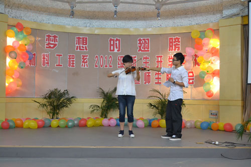 920晚,材料工程系在多功能厅举行“梦想的翅膀——2012级新生开学典礼暨师生联欢会”,材料系全体师生参加联欢会。在开学典礼上,材料工程系党支部副书记杨晓珍老师致辞,她希望新生在大学三年里学会四种品质:学会宽容、学会生存、学会专注、学会担当。台湾教师翁林廷彬代表教师发言,他鼓励大学生在大学中要学会自立。系主任牛丽媛老师则向同学们介绍学习理工科的方法。吴雯婕和童先同学分别代表新老生发言。