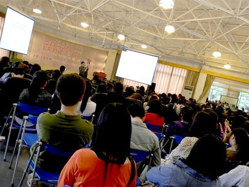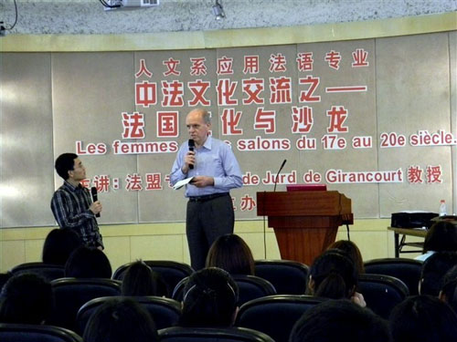 Claud Jurd de Girancourt教授介绍,平常我们所说的“沙龙”即为法语“salon”一词的译音,其原意为较大的客厅,也指上层人物住宅中的豪华会客厅,更多表示为贵妇人在客厅接待名流或学者的聚会。De Girancourt教授一边播放相关的PPT,一边用纯正的法语为同学们解释沙龙的发展与法国文化史,以便于大家更好地理解。他在讲座中指出,从17世纪起,法国上层社会的妇女们开始流行在家中举行聚会,出入这些聚会的多为“女才子”,她们谈论文学、政治、哲学等,沙龙由此而来。可以说,女性是沙龙的发起人与指导者。18世纪时,受启蒙运动的影响,许多新思潮萌芽,沙龙便成为这些文化学者交流新思想的地方;时至19世纪,它更“沦为”艺术家们孕育艺术作品的温床,沙龙的发展进入鼎盛时期。而进入20世纪后,第二次世界大战爆发,大多数沙龙活动被迫停止。随着时间的推移,战争已结束,沙龙却渐渐不复存在。那种文化聚会更多转移到了咖啡馆、酒吧、出版社等场所,也成了法国文人墨客新的聚集地。