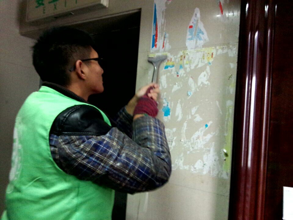 为响应温州市政府建设文明城市的号召,改善城市形象,12月28号,新田园社区联合我院绿色啄木鸟志愿队、城东税务所、街道驻居领导、街道驻格员,坐班干部、党员志愿者和小组长对楼栋内小广告,辖区绿化带进行整治。