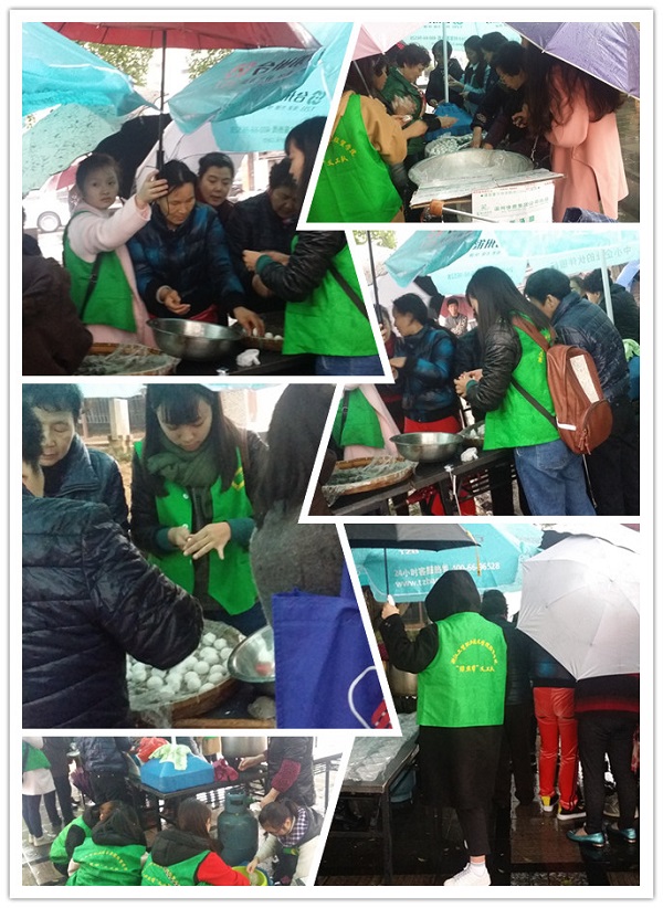 12月22日下午,阴雨濛濛,寒风习习,绿丝带服务队应邀参与五马街道鼓楼社区温暖汤圆DIY送温暖活动。在五马街道商贸中心搭建的服务点前,同学们与社区居民分工协作,或聚在桌子旁揉面粉、搓汤圆,或布置遮雨的伞具,或在冷水里冲洗杯碗,又或在架大锅、烧开水、煮汤 圆,各司其职,忙的不亦乐乎,纵使雨水打湿头发、衣服却全然不顾。当服务队员们将一碗碗煮好的汤圆送到前来品尝的社区居民手里,在一声声“阿姨,您趁热吃,我给您撑伞”的招呼声中,居民们端着一碗碗热乎乎的汤圆,吃在嘴里,暖在心里。