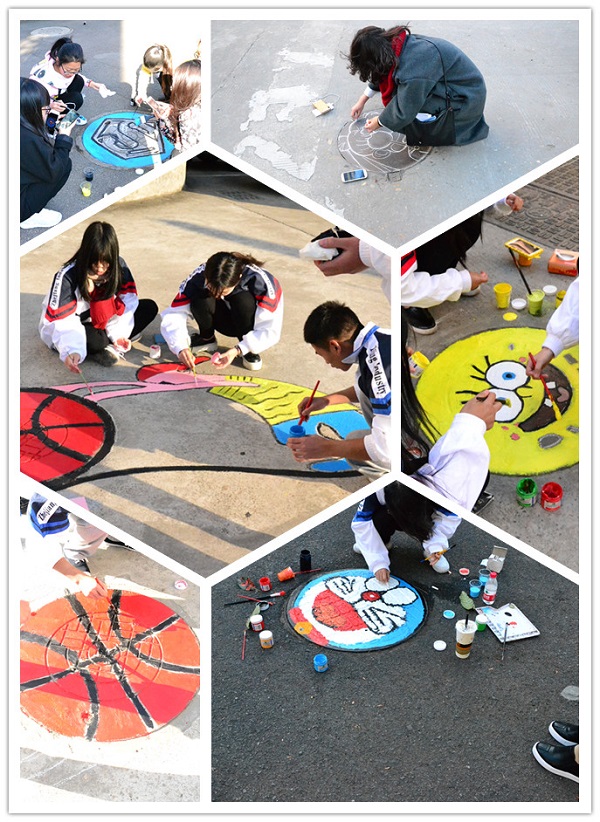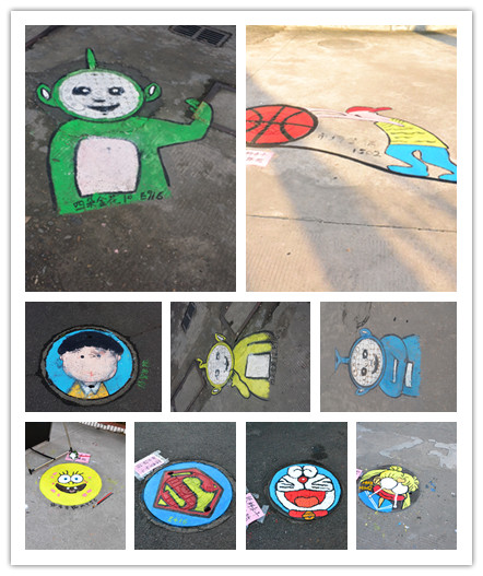 一个个或方、或圆的井盖,在同学们的妙手下,全都“穿”上靓丽的新衣,成为冬日校园里的一道道靓丽的风景线。有摇滚范儿的篮球少年,倡导同学们即使在寒冷的冬日也不要忘记锻炼身体,走出宿舍,走向操场;有卖萌的哆啦A梦、圆滚滚的海绵宝宝、呆萌的姿势帝——天线宝宝等等,意蕴同学们要用孩子般单纯美好的心去审视周围,谦和、友善地对待身边的同学、朋友。等等。