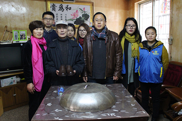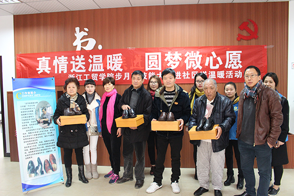 最后,学院步月宾温州市技能大师工作室大师步月宾老师携青年学生赴社区开展“真情送温暖,圆梦微心愿”活动。此次活动前期经过社区微心愿征集,共征集到4位低保户老人、1位困难老党员微心愿。微心愿主要内容是适合老年人穿的舒适真皮皮鞋。正好步月宾大师将一项制鞋专利“双气囊排气鞋、老年保健鞋”转化为成果,特为5位苦难群众个性化定制5双皮鞋。当步月宾大师一行走进老党员章圣荣家给他试穿鞋子时,他非常赞赏,说穿的很舒适、很合脚,感谢浙工贸师生。“步月宾技能大师工作室”于2013年11月由温州市人力资源和社会保障局授牌正式成立,工作室主要致力于固特异手工鞋工艺的传承、功能鞋的研发、皮鞋舒适度的研究等工作。