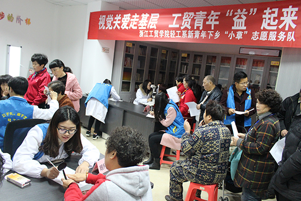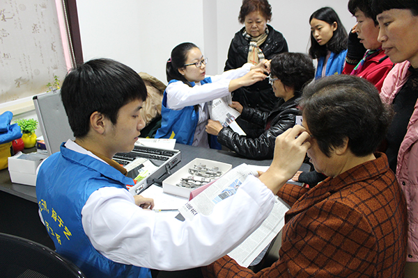 在老年人视觉关爱活动现场,浙江工贸眼视光中心师生志愿者们耐心地为各位老年人做眼病筛查、眼底检查、眼压及视力等项目义诊,根据检查情况,详细询问了居民的病情及用药情况,认真做好记录,并根据病症给出合理建议。前来检查和咨询的村民络绎不绝,他们表示,“不用出远门就能享受到像医院的优质服务,特别开心”。在现场我们还为远视患者免费赠送了老花镜,整个活动持续两个小时,共为60余居民做检查,赠送老花镜30副,价值1500余元。