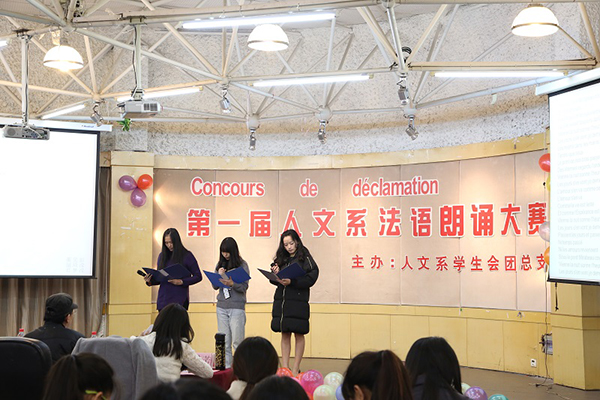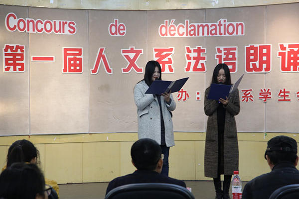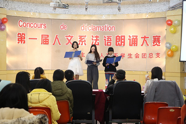 12月7日晚,人文系在学院多功能厅举办了首届法语朗诵大赛决赛。本次比赛人文系法语专业共有大一大二共16组参赛选手参加。通过预赛的角逐脱颖而出的他们各自发挥着自己的特色,用深情的法语朗诵诠释了对诗歌、文章情感的把握及对专业的理解喜爱,为观众带来了一场视觉听觉的盛宴。这也是人文系为加强法语专业建设和提升学生的专业兴趣而开展的一系列融专业与校园文化活动为一体的教育引导活动新尝试。此前,人文系已定期每年开展有法语技能大赛、法语歌曲演唱大赛、法语写作大赛等活动。