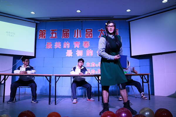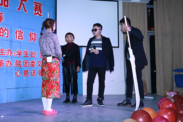 院团委艺术团舞蹈队的闪亮登场给观众们带来了精彩的舞蹈开场秀。劲爆的旋律,热情的舞姿顿时将现场的气氛推向高潮。率先登场的是汽机学院的《爱笑的女孩》,小品所富含的正能量感染着现场每一位观众,引发同学们对生活的思考,坚信爱笑的女孩运气不会太差。紧接着第二个出场的是成教学院的《考试》。在小品中,男扮女装的反串角色让观众乐此不疲。情节更富于戏剧化,给人一种耳目一新的感觉。观众们身临其境,节目博得满堂喝彩。随后出场的是管理学院《一眨眼的青春》与技师学院《青春你好》。两者小品题材十分接近,然而表演形式却各不相同。前者是以歌曲和动作相结合,后者更注重于表演。但他们深情的演唱与走心的表演都获得了观众的好评,让观众大赞!接下来,党建中心倾情的演出和院团委艺术团的“穿越剧”更让观众们欢笑不已。党建中心的《年少有你》告诉我们青春,永不散场!院团委艺术团的《三顾茅庐》则是告诉我们对待贤才,又何止三顾!