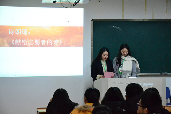 表彰大会开始,大家在主持人沈浩然同学的带领下进一步了解了阳光义工活动意义,阳光义工志愿服务的宗旨与目的。之后党务部干事缪依婷和曹丽杰同学为大家带来诗朗诵——《献给志愿者的诗》,现场同学们安静聆听其中的一字一句,似乎是义工活动时的情景又出现于眼前,同学们情不自禁得鼓掌。党务部同学还将各班级阳光义工活动时候的照片精心制作成视频,带领现场同学再一次回顾活动时的场景,那时候的付出与收获,都融化在现场会心的笑声中。