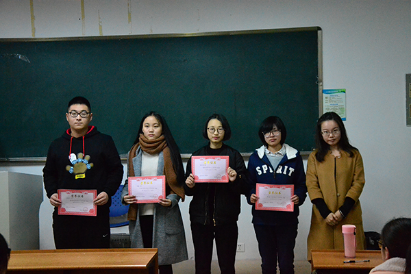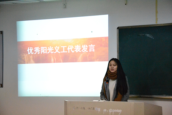 随后,张婷老师为各班阳光义工,优秀党务组长及优秀阳光义工班级一一颁奖。最后,张婷老师作了总结讲话。她对团总支学生会党务部干事们为阳光义工活动所作出的辛勤付出表示肯定,并对2015级各班级入党积极分子们对此次活动的积极参与及形式多样的义工活动表示了高度评价。张婷老师指出,经贸学院重视入党积极分子的培养工作,把志愿者服务工作作为入党积极分子培养考察的重要途径,使入党积极分子在志愿服务中磨练品质、在实践锻炼中提高素质。她希望入党积极分子在今后的学习、工作和生活一如既往地发挥好模范带头作用,促进自己全面发展。