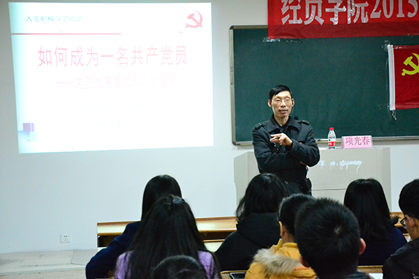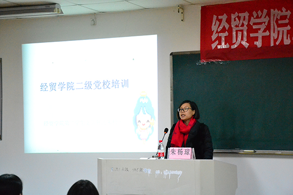 2015年12月29日、12月30日晚,6304教室迎来经贸学院2015年秋季学期入党积极分子培训。此次培训对象为经贸学院2015级全体入党积极分子,本期二级党校培训共分为三场,主讲老师分别为经贸学院党总支书记项光春老师,经贸学院党总支委员、第二学生党支部书记朱杨琼老师,经贸学院党总支委员、国贸专业刘敏老师。
