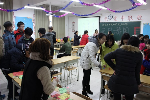 2015年12月30日下午,技师学院(杭州校区)全体师生八百余人在教学楼隆重举办了以“立德树人 激扬青春”为主题的元旦游园活动。教学楼张灯结彩,彩球高挂,充满了节日的气氛。技师学院(杭州校区)副院长曹琦老师、欧阳江林老师、教管中心陈伟华主任、综合办俞欢春主任、学管中心周少勇主任等到各个班级与同学们欢聚一堂,共庆元旦佳节。