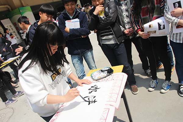 活动当天正值温州市人大代表走进校园宿舍,关爱大学生健康成长一行来我院走访调研。下午4时左右,人大代表经过学子广场驻足观看,他们肯定了学院的校园文化建设,鼓励在校园内多组织此类活动,以丰富同学们的课余生活、陶冶同学们的情操。活动现场有创作部成员为同学现场书法表演,有现场同学体验书法写作,使得更多的同学能够体验软笔书法的魅力。活动结束时,我们也招收到了许多对软笔书法以及装裱技巧感兴趣的同学加入我们的行列。