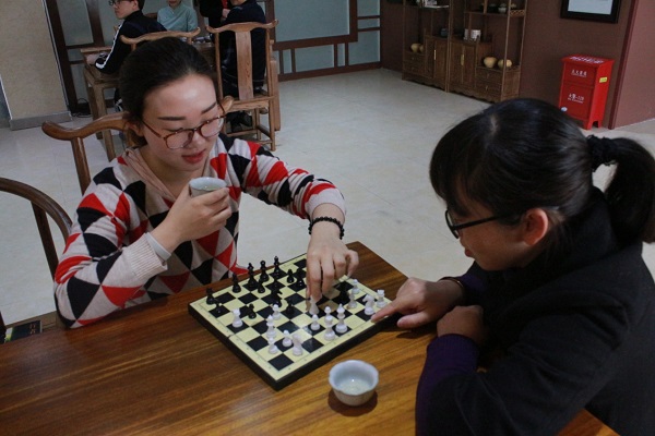 下午1点半,女教师们来到了大益爱心茶室,参加了这次别开生面的活动。活动首先进行了中国象棋对弈,作为中华民族的文化瑰宝之一的象棋,怡神益智,启迪思维。在不忘传统文化的同时,我们女老师也同时接轨世界,进行了国际象棋的对弈。老师们一边品茶一边下棋,轻松愉快地切磋交流下棋之道,最终高尧老师获得中国象棋第一,陈芊妤老师获得国际象棋第一。随后,“美女”老师们各自选了一本书进行品读,每一位都是静静阅读的“美女子”。