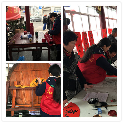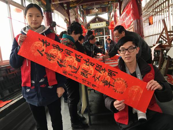 活动现场,社区请来书法协会的老书法家们现场写就春联赠予居民。现场居民人头攒动、络绎不绝,几位书法家忙的不亦乐乎。服务队的志愿者们虽然软笔功力有限却主动上前,研磨、提纸、晾干春联、为书法家及居民斟茶倒水等,并根据居民的要求为居民提供建议,“我儿子做生意的,你看我们需要什么字的春联?”“褚老师,这位阿姨家是做生意的,您看给她提‘堆金积玉迎富贵安居乐业创前程’可以吗?”“哈哈,小伙子,你文学水平很好啊,不错不错,我马上写”。“主要是刚刚看各位书法老师都是这样为居民题字的,我们在一旁观察的久了,就默默记住了。而且,平时过年也会注意各类各样的对联,慢慢的就记在心里了”当被问及是如何做到可以根据居民需求提供对联建议时,服务队陈星搏回答道。同时,书法协会的老书法家为表达对同学们的赞誉,现场为服务队的同学们写就对联“世事洞明皆学问人情练达即文章”赠予服务队,希望同学们能够珍爱国粹艺术、传承中华传统文化。
