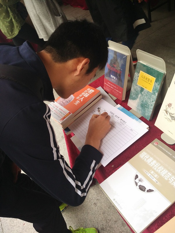 活动现场共展出了500多种最新出版的各类畅销新书,并推出为师生开展利用图书馆微信,推广读者手机借阅查询、图书荐购等宣传,以及免费清洗眼镜等活动,吸引了众多师生,短短的几个小时,共选出荐购图书200多册,同时,100多位学生对自己所选新书进行了预约借阅登记。在活动期间,在场学生都反映“你选书,我买单”活动很有新意,能让大家直接选购最想要的书。