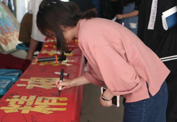 同学们积极参与、认真答题,重温了“五四”运动的光辉历程。答题后,很多同学在横幅上郑重签名,写下自己争做一名“五四”精神弘扬者的意愿:聆听历史、弘扬正气、增长才干,让五四精神飞扬!