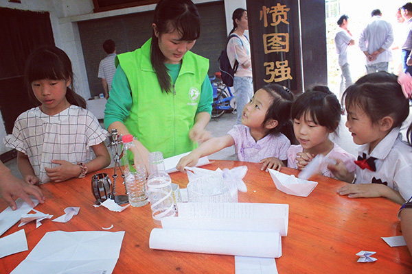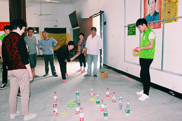 套圈、模拟保龄球、吹蜡烛、运送乒乓球、手工小制作、猜谜语等各色传统娱乐活动,在吸引小朋友参与的同时,也吸引不少村里的老年人参与其中。其中,套圈、模拟保龄球活动竞争性强,最吸引大家眼光,村民们的参与度极高。手工小制作的桌子前面围着小朋友,志愿者们教小朋友如何用废旧的纸张和塑料瓶制作出漂亮的小花朵、收纳盒、花瓶等小用品。