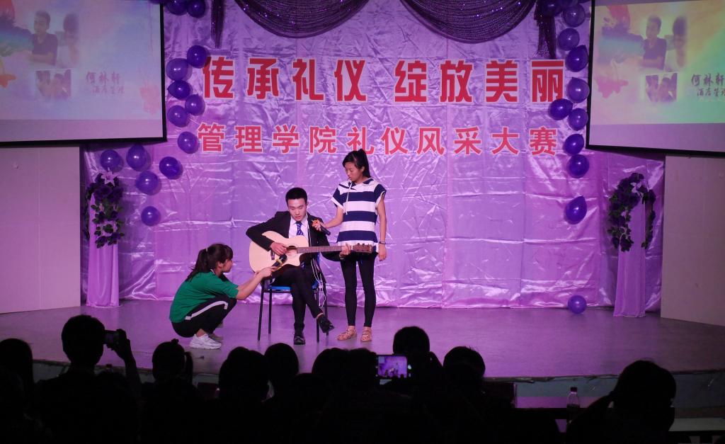 充满活力的舞蹈秀和12位参赛选手的登场亮相拉开了本次大赛的序幕。比赛共设三个环节,情景模拟、知识回答和才艺展示。在情景模拟和知识回答环节中,参赛选手展现了自己独特的个人风采以及对礼仪知识的良好掌握。才艺展示环节更是让在座的同学们大开眼界,插花、茶艺、吉他弹唱、舞蹈等轮番上阵,精彩的才艺演出博得在座的阵阵惊呼与掌声。此外,比赛中穿插的游戏互动环节也将现场的氛围推到至高点。