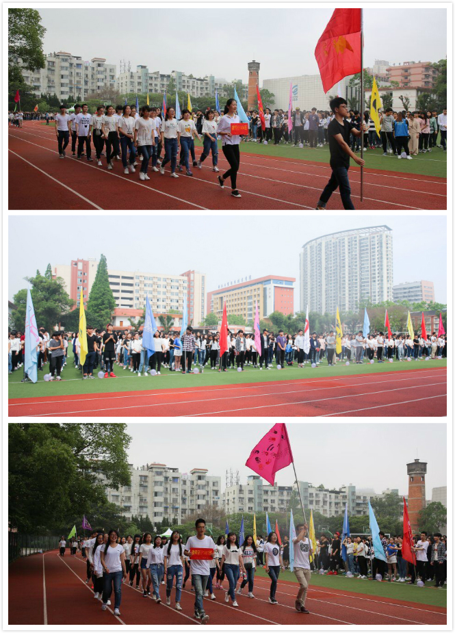 5月22日早上8点半,开幕式在庄严的国歌声中拉开序幕。22个班级统一着装、举着班旗、喊着口号,从主席台前精神抖擞地走过,展现不同的班级风格。轻工系杨松涛书记致开幕辞,希望同学们通过运动会、提高健康锻炼的意识,增强自我体质,在比赛中展现班级风采,凝聚班级力,赛出正能量,并预祝趣味运动会成功。
